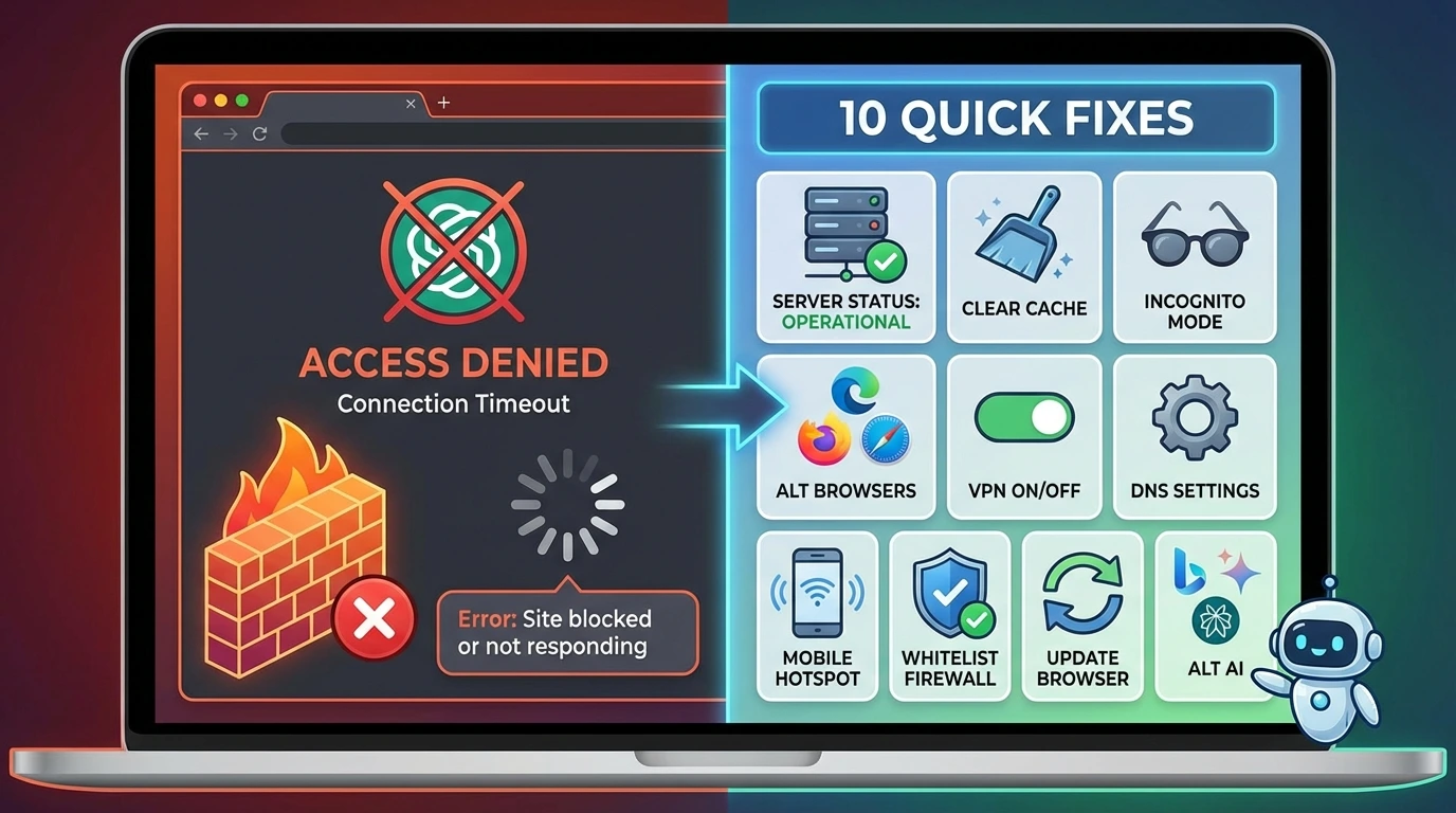 Quick fix priority adalah pertama cek status.openai.com untuk memastikan server beroperasi normal. Kedua, clear cache dan cookies browser. Ketiga, ganti browser atau gunakan mode incognito. Keempat, gunakan VPN jika diblokir network institusi.